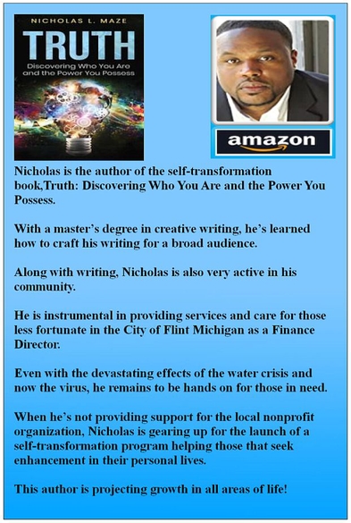 "TRUTH Discovering Who You Are and The Power You Possess" by Nicholas L. Maze All of us face experiences in life that may lead to challenges and create false truths. Before you know it, you are trapped inside of a world that you never wanted for yourself with no signs of how to escape. Believing that you are on a dead end street, which is yet another false truth. Nicholas Maze shows how to destroy those false truths in your life by teaching who you really are and the ultimate power that you possess. In the process, it is his goal that you obtain every desire you've ever wanted in your life. This could be a career, financial stability, and even relationships. With the knowledge you receive from TRUTH, all of this is obtainable. This latest work from Nicholas is focused on self-empowerment and the knowledge of one's self, where all growth and success awaits. #