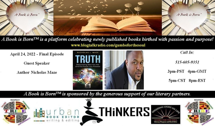 A Book is Born™ Season IV-Epi. Six airs April 24, 2022 with Our Guest Speaker is Author, Nicholas Maze, to discuss his literary journey, and the 411 on where to grab a copy of his new page turner!