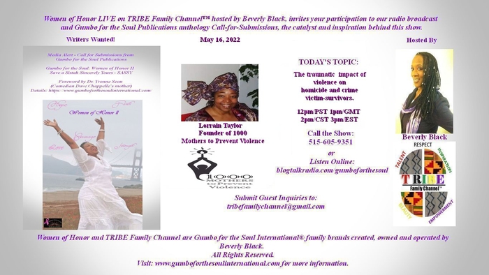 Today on Women of Honor Radio via TRIBE Family Channel our Guest Speaker will be Lorrain Taylor-Founder of 1000 Mothers to Prevent Violence.