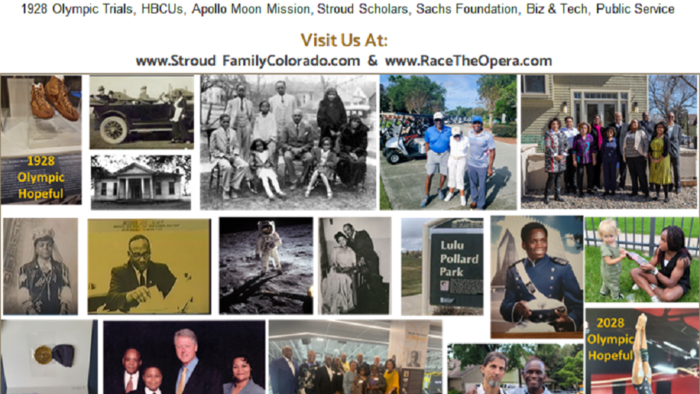 Race the Opera, chronicles the family story through the true life journey of Dolphus' 2,000-mile trek from Colorado Springs to Boston to compete in the 1928 Olympic Trials at Harvard Stadium. Please see StroudFamilyColorado.com and RacetheOpera.com for details.