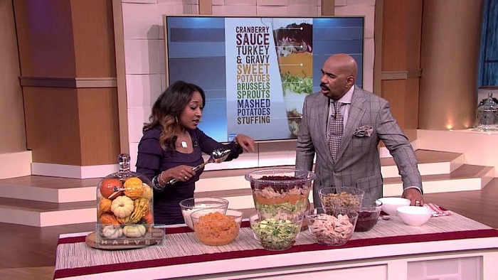 Monique wants Steve to try this year's latest Thanksgiving trend. It’s compact and easy to transport if you’re doing dinner at someone else’s house this year. It’s layered with all the traditional Thanksgiving fixings: stuffing, mashed potatoes, a layer of vegetables, sweet potatoes, turkey with gravy and cranberry sauce to top it all off.