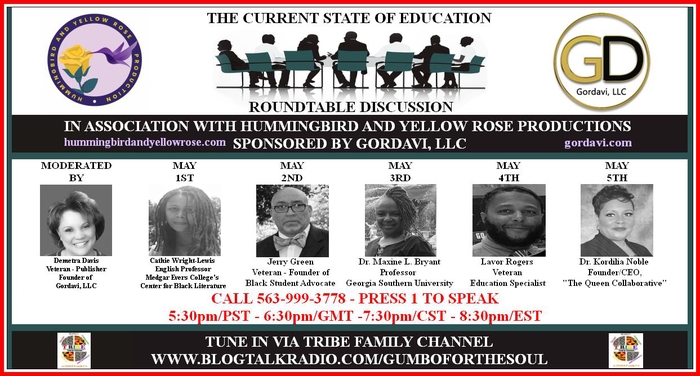 Maxine Bryant, Ph.D will be Demetra Davis' guest today! You really don't want to miss this! The Current State of Education - Roundtable Discussion Presented by Gordavi, LLC on TRIBE Family Channel in association with Hummingbird and Yellow Rose Productions, invites your participation to join Demetra Davis, Veteran and CEO of Gordavi, LLC., in a roundtable discussion about The Current State of Education in America. Join us all week long May 1st - May 5th as we breakdown the issues impacting our community and explore solutions for change. Call 563-999-3778 at: 5:30pm/PST 6:30pm/GMT 7:30pm/CST 8:30pm/EST PRESS 1 to speak. Listen Online LIVE/ARCHIVED: www.blogtalkradio.com/gumboforthesoul TRIBE Family Channel is a Gumbo for the Soul International family brand.
