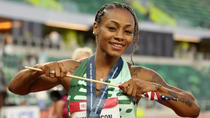 Before the start of the 100m race at the U.S. Track and Field Championships, she had a sudden change of heart about her look and decided to switch things up. Instead of her usual orange install, she opted for scalp feed-in braids underneath a wig. In a video posted on Twitter, Richardson can be seen getting ready for the race with a determined expression on her face. Suddenly, she made a bold move and removed the wig, revealing straight-backs with intricate designs and colorful tendrils. Her braids were black at the scalp and gradually faded into a beautiful platinum ombre. One side of her head featured braids styled in a heart shape, while the other was adorned with a star.