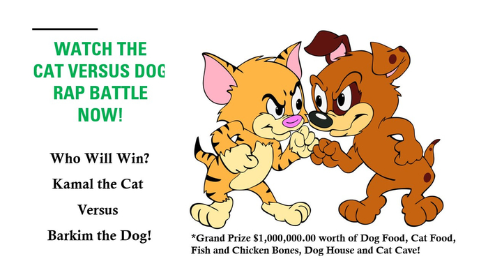 Yo, Check out this hot rap battle. Cat vs Dog. Kamal the Cat and Barkim the Dog battle it out with their lit display of bars for grand prizes.