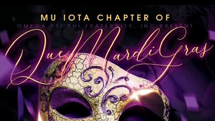 The Distinguished Brothers of the Mu Iota Chapter Unincorporated Association of The Omega Psi Phi Fraternity Inc. present the Que Mardi Gras