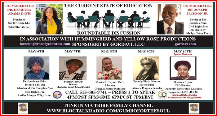 The Current State of Education - Roundtable Discussion Presented by Gordavi, LLC on TRIBE Family Channel in association with Hummingbird and Yellow Rose Productions, invites your participation to join Co-Moderators Dr. Demetra Adams Davis, Veteran and CEO of Gordavi, LLC., and Civil Rights Icon, Dr. Joseph Jackson, Jr., Leader of Tougaloo Nine, in a roundtable discussion about The Current State of Education in America.