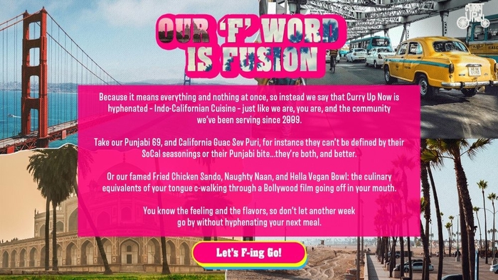 California is home to the largest population of Indians outside of India and our style of cooking is ~9,000 miles and ~125 years in the making. Traditional rituals with flavor-forward flair. Firmly familiar to some and fantastically fun for all. Indian at heart while Californian in spirit. This is your Auntie’s tikka wrapped in your Tía’s burrito...Bombay tandoori riding with Bay Area burgers...New Delhi naan if pizza-fied by SoCal surfers. You’ve had thalis and kathis and biryanis in the past. But this is Curry Up Now: the hyphenated hero of the Indo-Californian kitchen, remixing street food from the Land of Spices with culinary classics from the Land of Dreams.