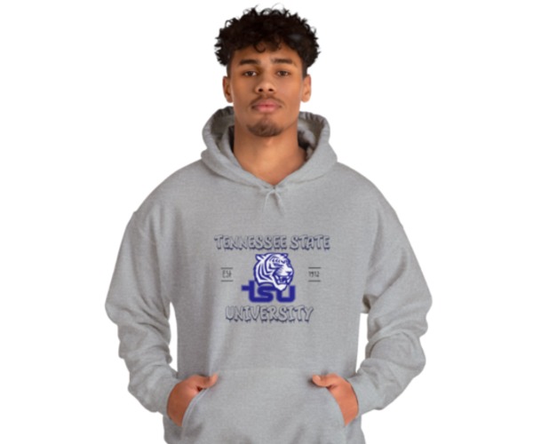 Color assorted Tennessee State University sweatshirts in white, sport grey, and red. These sweatshirts are made of 50% cotton and 50% polyester.